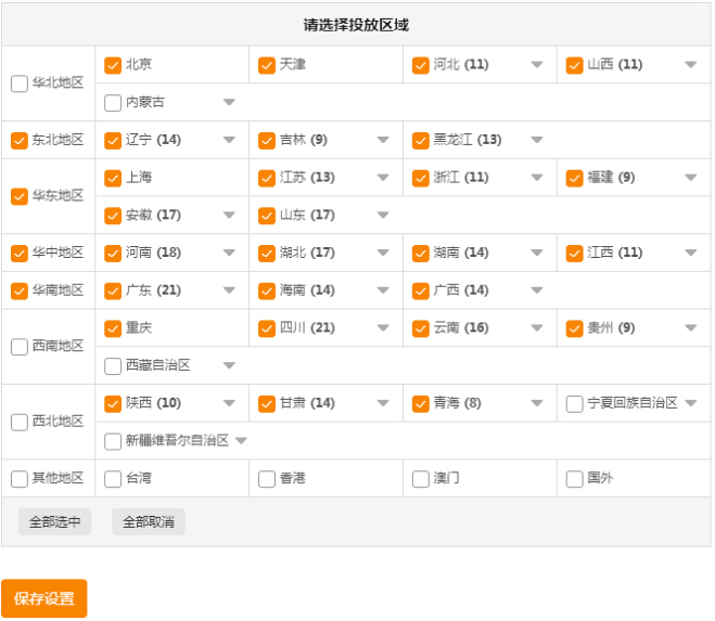 设置投放区域,一般情况下,标准投放,考虑到店铺的实际情况,可以选择海外、港澳台,以及偏远地区等不投放。