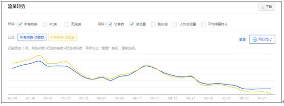 对比上面的最近30天的访客数据,我们可以看到,这个店铺的访客数据实际上下降的比较厉害。因为整个行业大盘从7月初开始,整体访客数据上扬幅度较大,但是这个店铺的访客数据从8月27号开始就一直是下降的趋势。行业大盘上升,店铺数据下降,那肯定是店铺出问题了,接下来肯定就是找原因了。